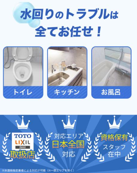 北海道から沖縄まで全国対応しており、トイレ・キッチン・お風呂などの詰まりや水漏れのトラブルに24時間365日対応・最短30分で駆けつけて対応してもらえます。