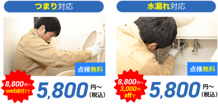 トイレのつまり・トイレのタンクの水漏れなどの基本料金は5,800円~(8,800円からWEB限定3,000円OFF)という明確な料金設定で、突然のトイレのトラブルでも安心してご依頼いただけます。